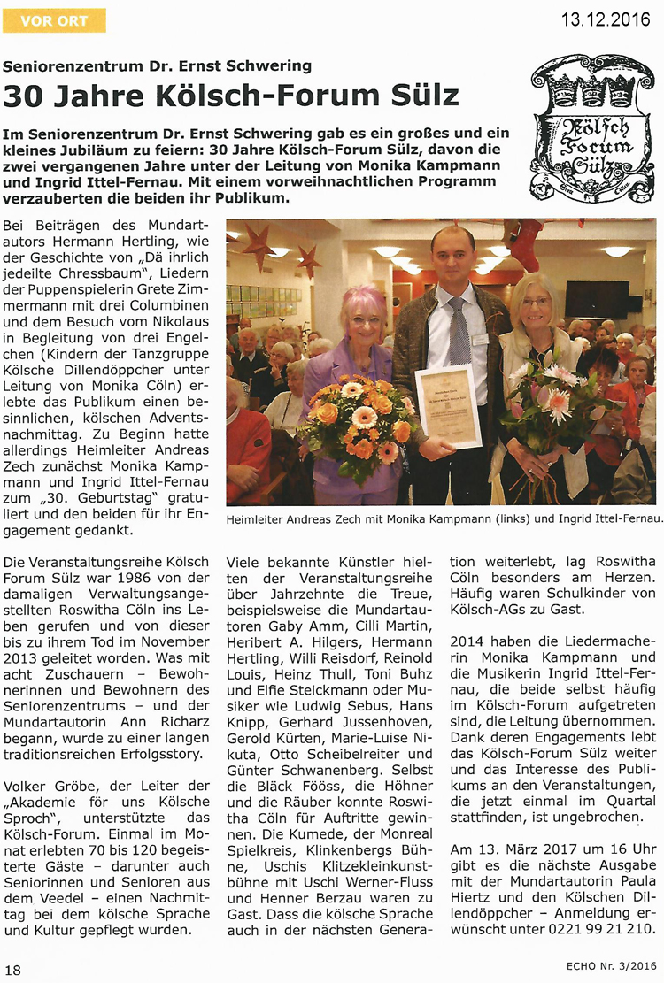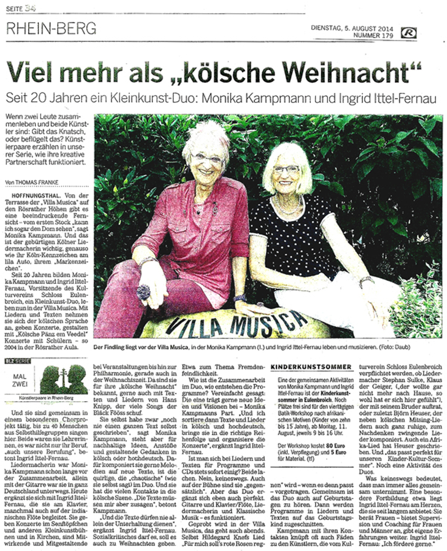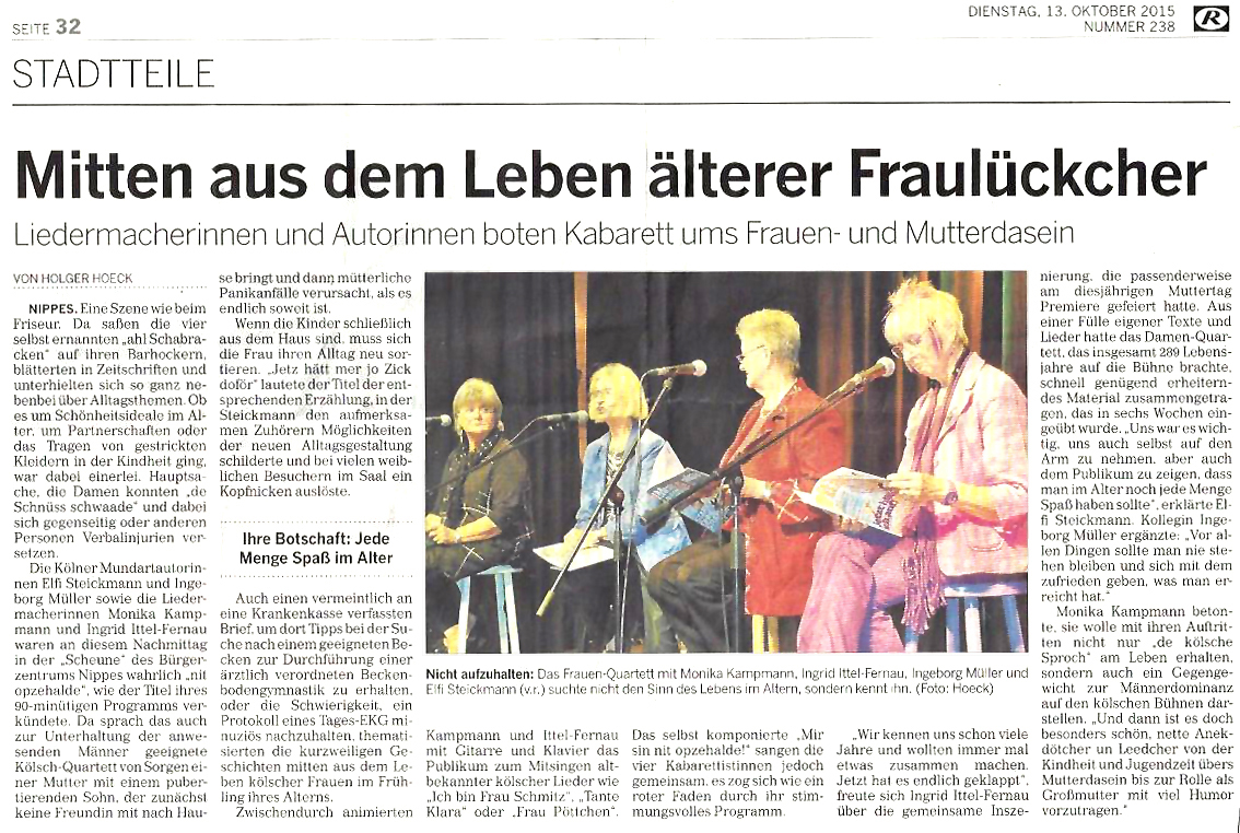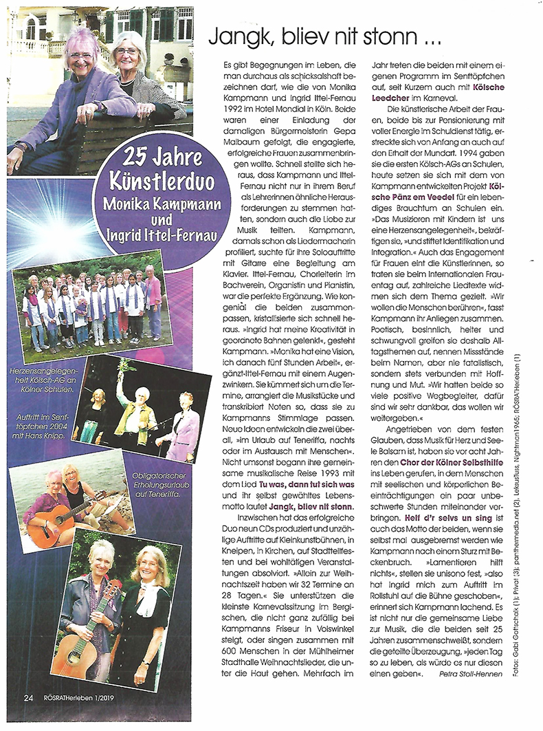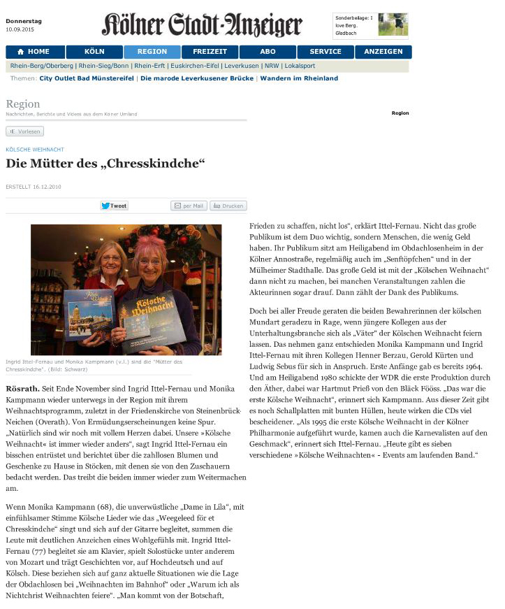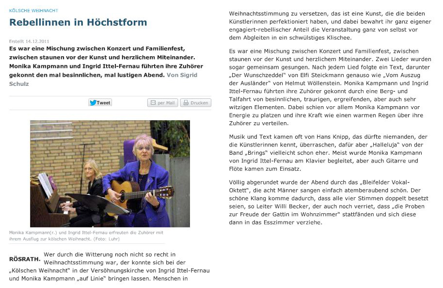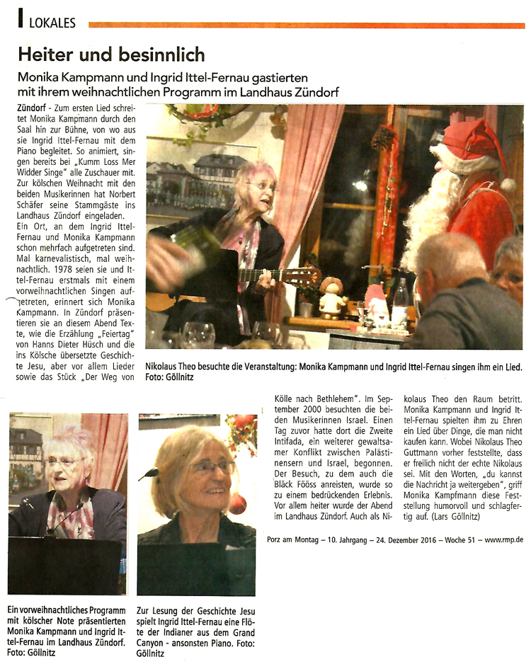Ab Ende November sind Ingrid Ittel-Fernau und Monika Kampmann wieder unterwegs in der Region mit ihrem Weihnachtsprogarmm ... "Natürlich sind wir mit vollem Herzen dabei, unsere 'Kölsche Weihnacht'