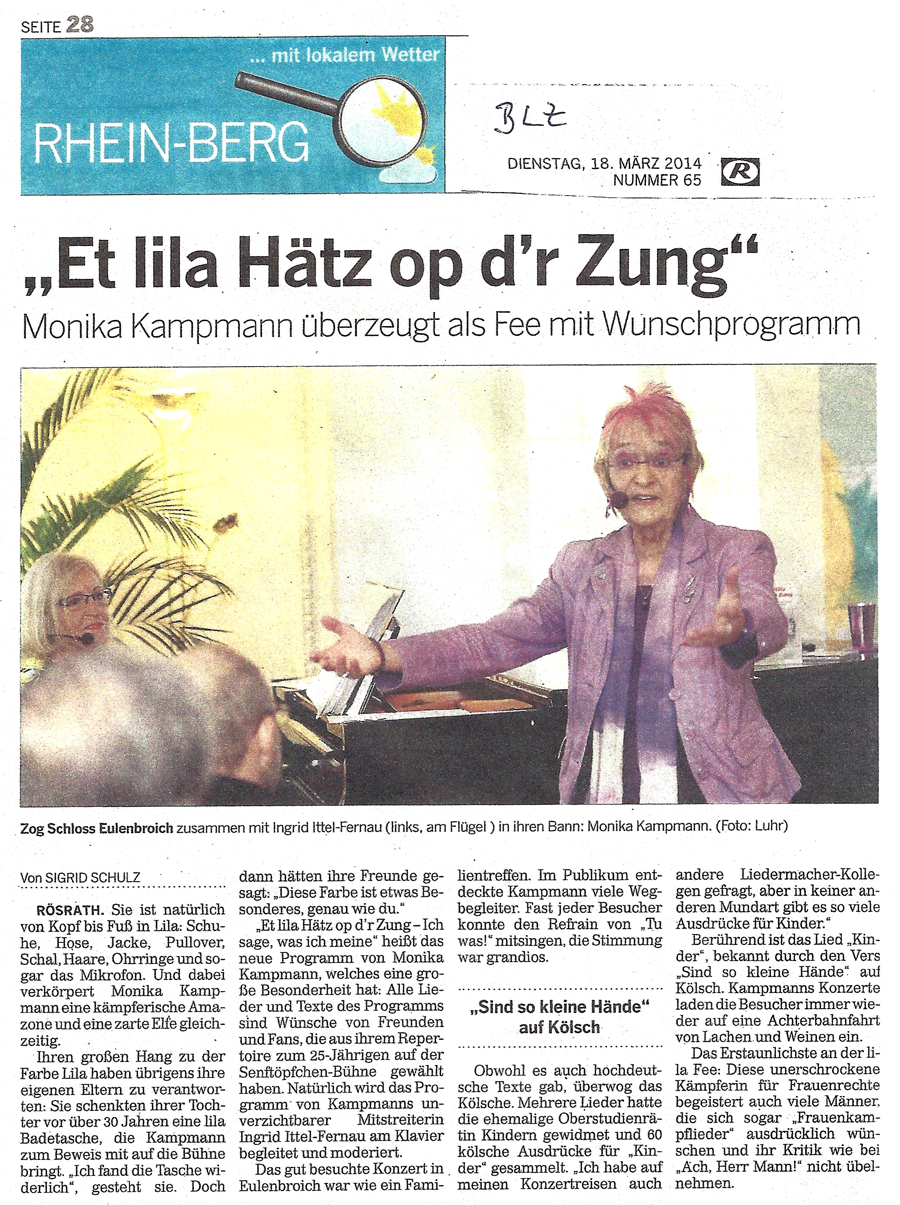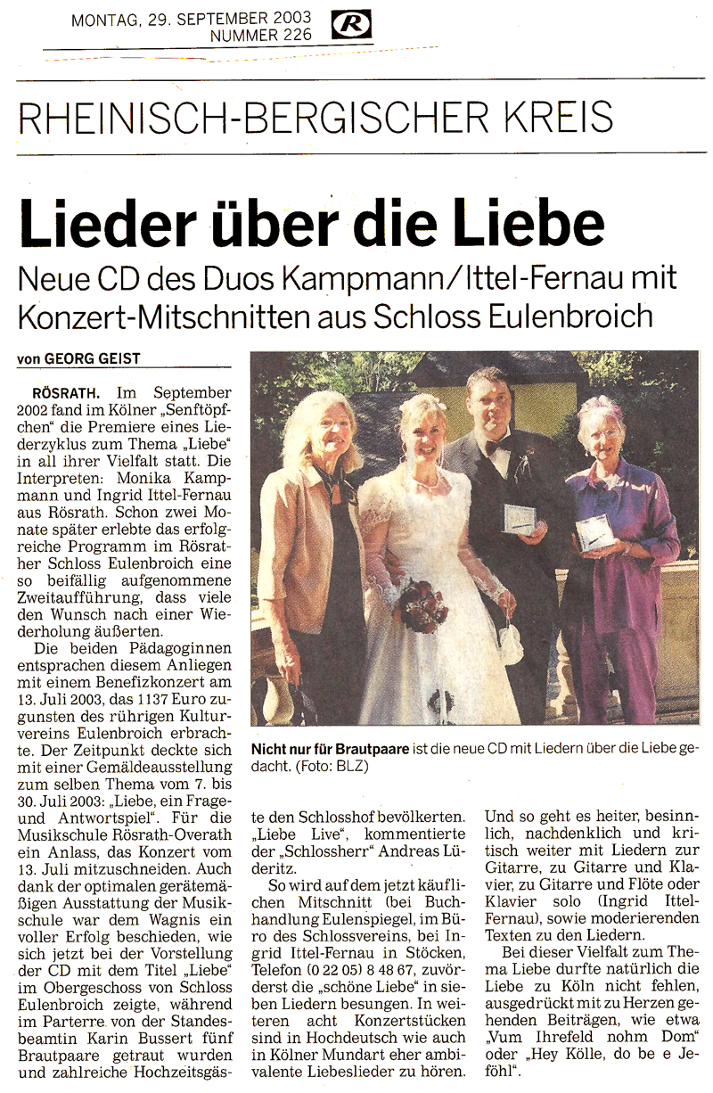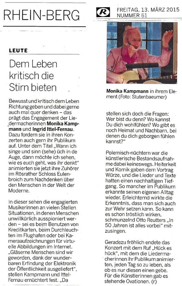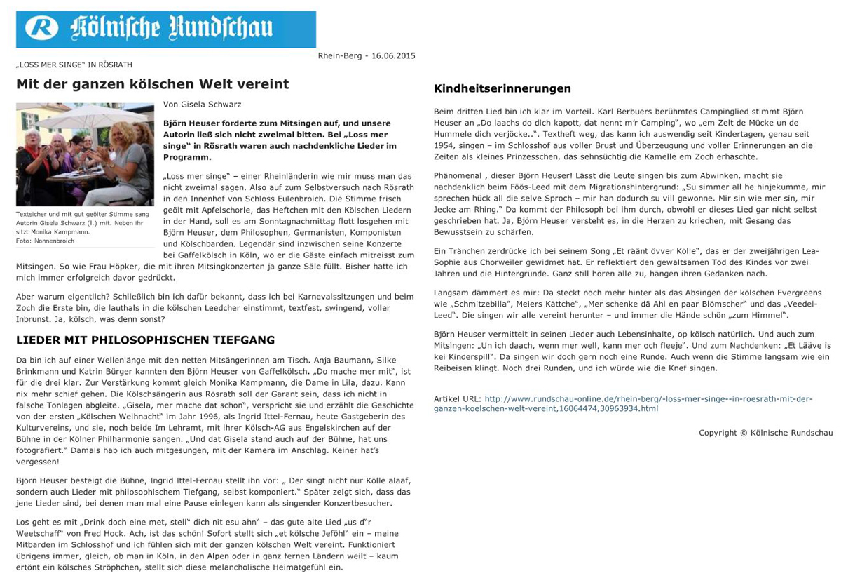 "Man wird nie satt, auch nicht bei der abschließenden Zugabe von Reinhard Börner: "Jeden Tag so zu leben“, und es bedurfte schon einiger kölscher Zugaben, und abschließend natürlich des unabdingbaren Berzau-Evergreens "Kutt jot heim!", um ein höchst zufriedenes Publikum zu den Schloss-Portalen hinaus