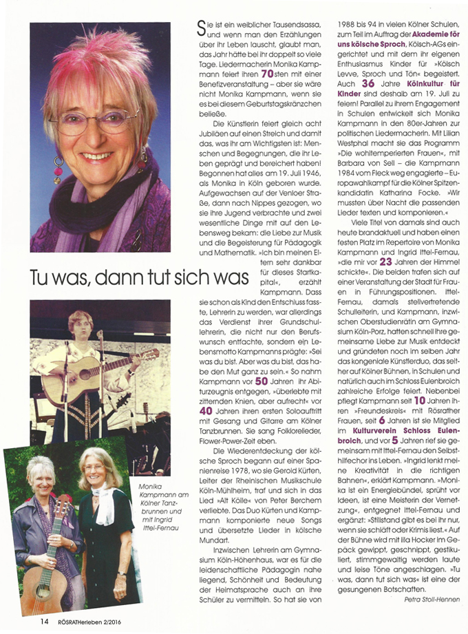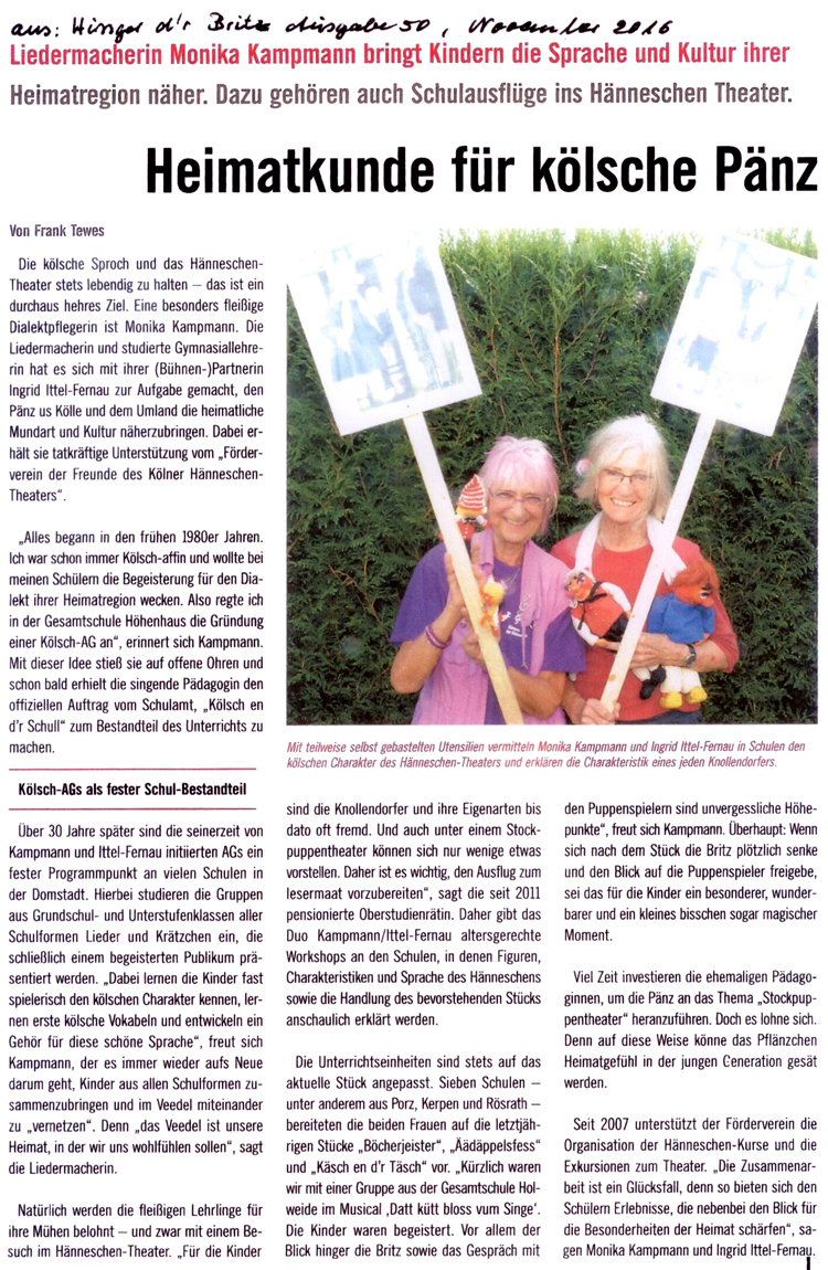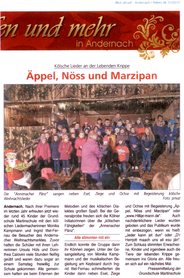 Das wäre gewiss nicht so locker und fröhlich gelungen, wenn nicht Monika Kampmanns überaus ausdrucksvollen Hände und Arme im Spiel gewesen wären! Sie trieb die Kinder leicht und doch fordernd zu immer neuen Höchstleistungen an, und mit der bewährten Klavier-Unterstützung von Ingrid Ittel-Fernau gelang das überzeugend. Die Beiden sind gleichzeitig die Initiatorinnen der „Kölsche-Pänz“- Veranstaltungen. Wie gut, dass es sie gibt!