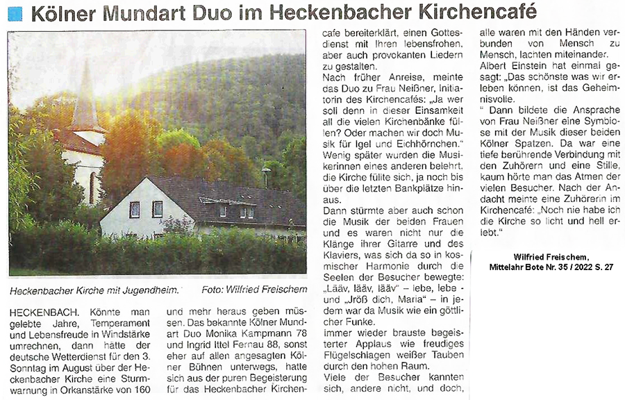 "Viele nachdenkliche und zum Schmunzeln anregende Lieder und Texte füllten das Konzertprogramm: andächtige Stille, jugelnder Applaus, freudiges Mitsingen und die lachenden Augen in den Gesichtern
