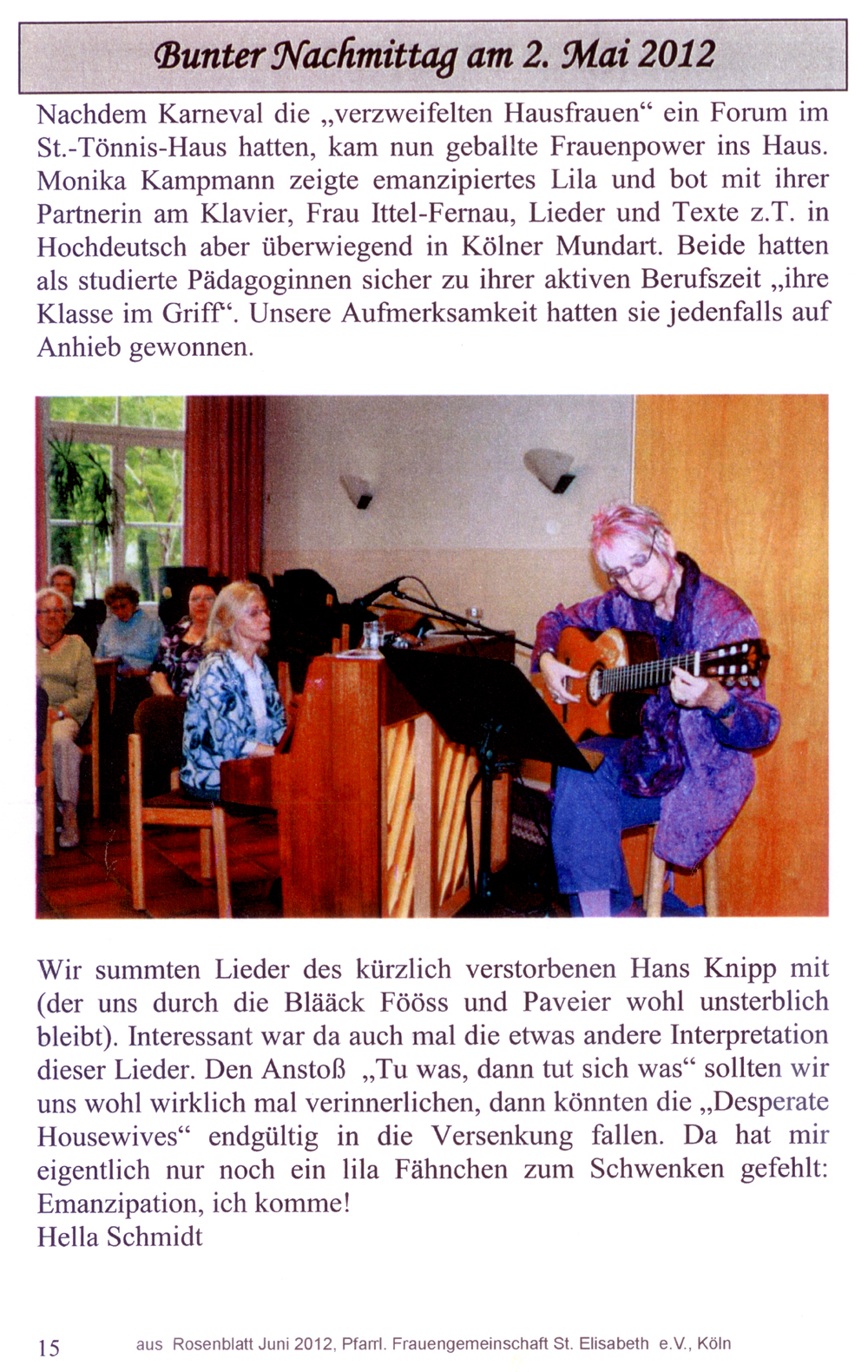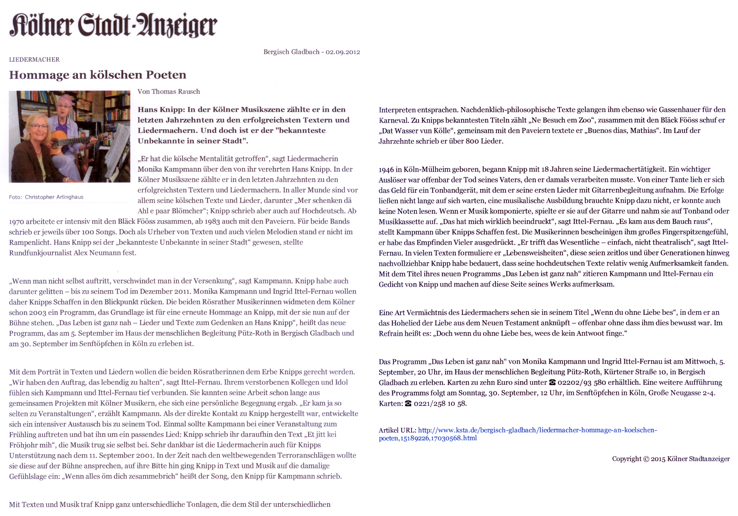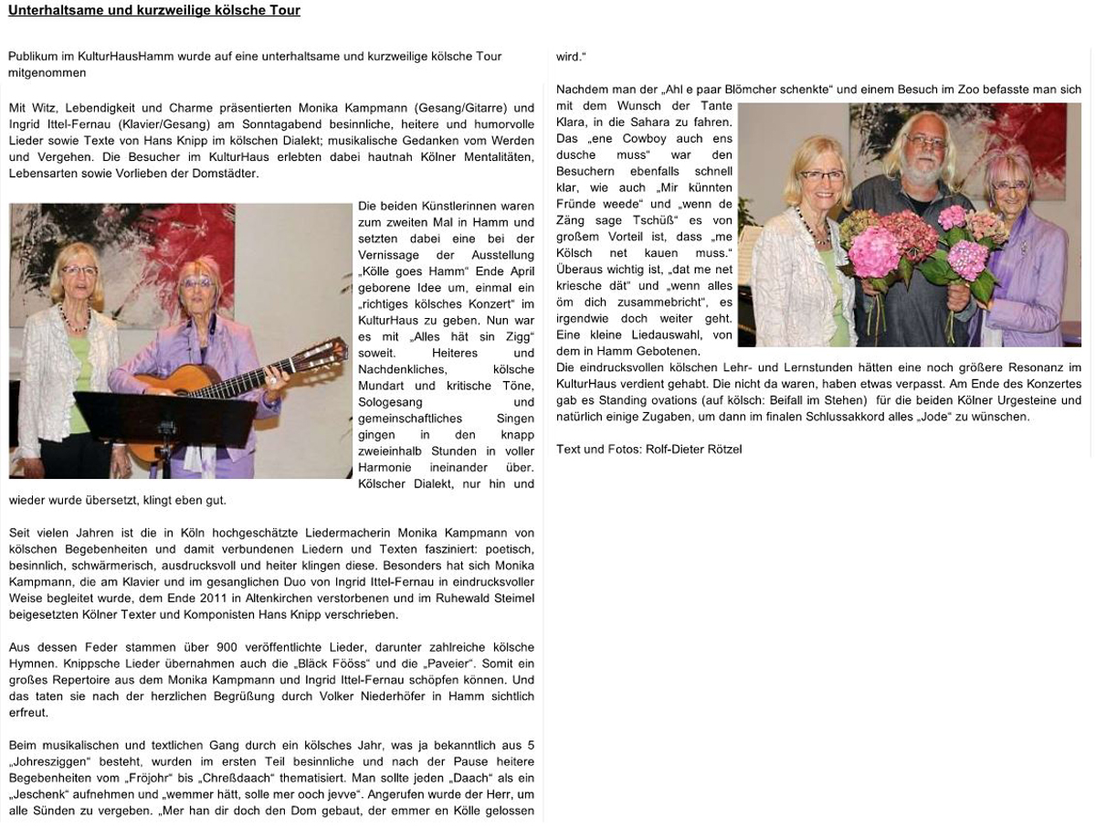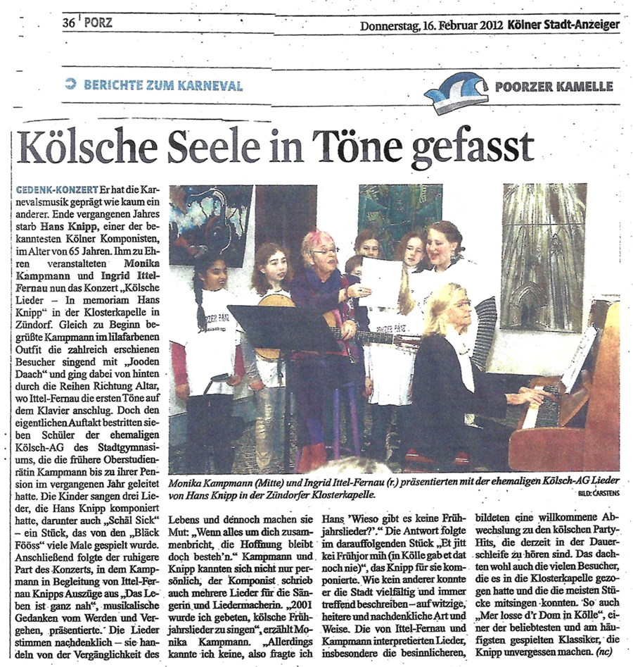Hans Knipp hat aber auch viele hochdeutsche Texte geschrieben: Das Konzert am 9.2.2012 im der Zündorfer Kapelle bringt
