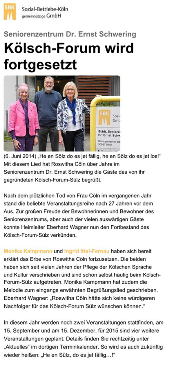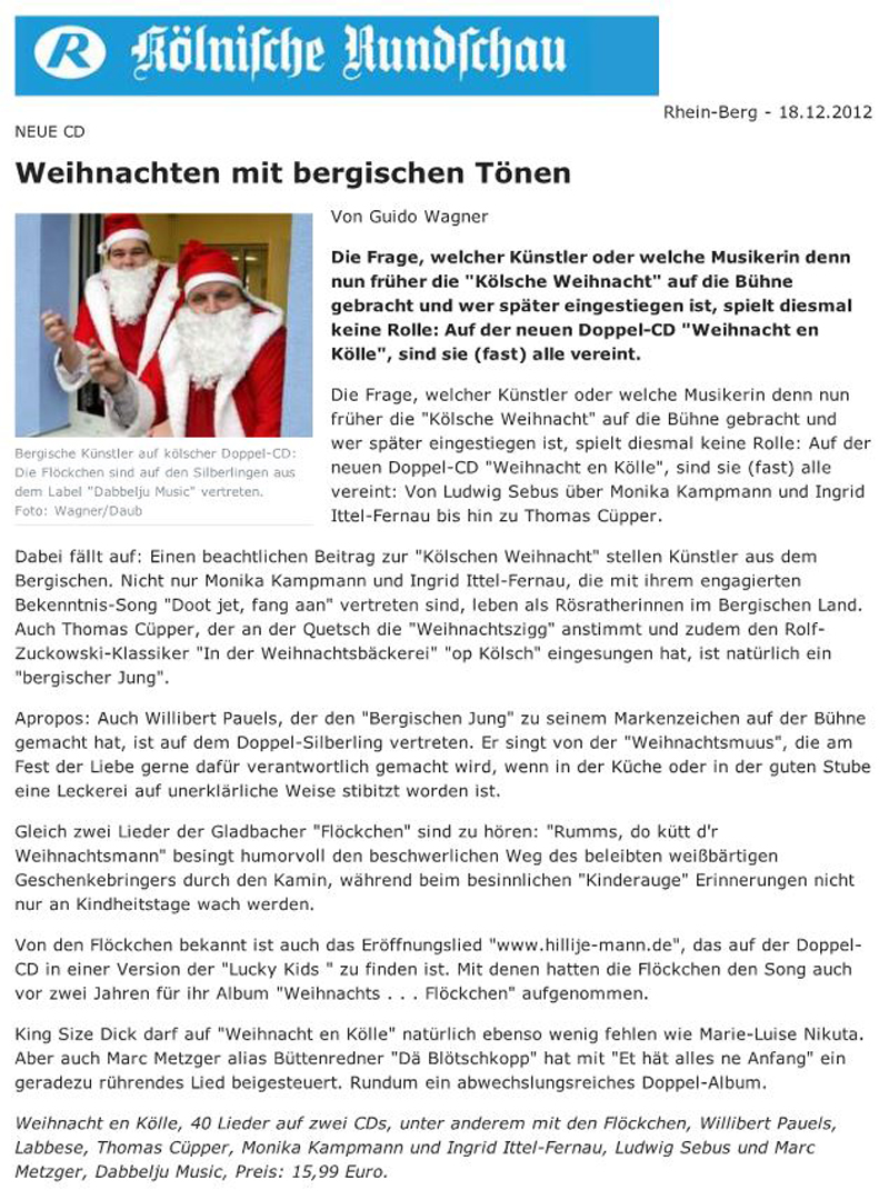 "Auch für die des Kölschen weniger mächtigen Zuhörer ist abwechselungsreich Verständliches in Hochdeutsch dabei, manchmal auch mit im Dialog gelesenen Texten. Das alles erzeugt Gelassen- und Ausgeglichenheit, macht Freude beim Zuhören, sodass man eigentlich nicht genug bekommen kann,